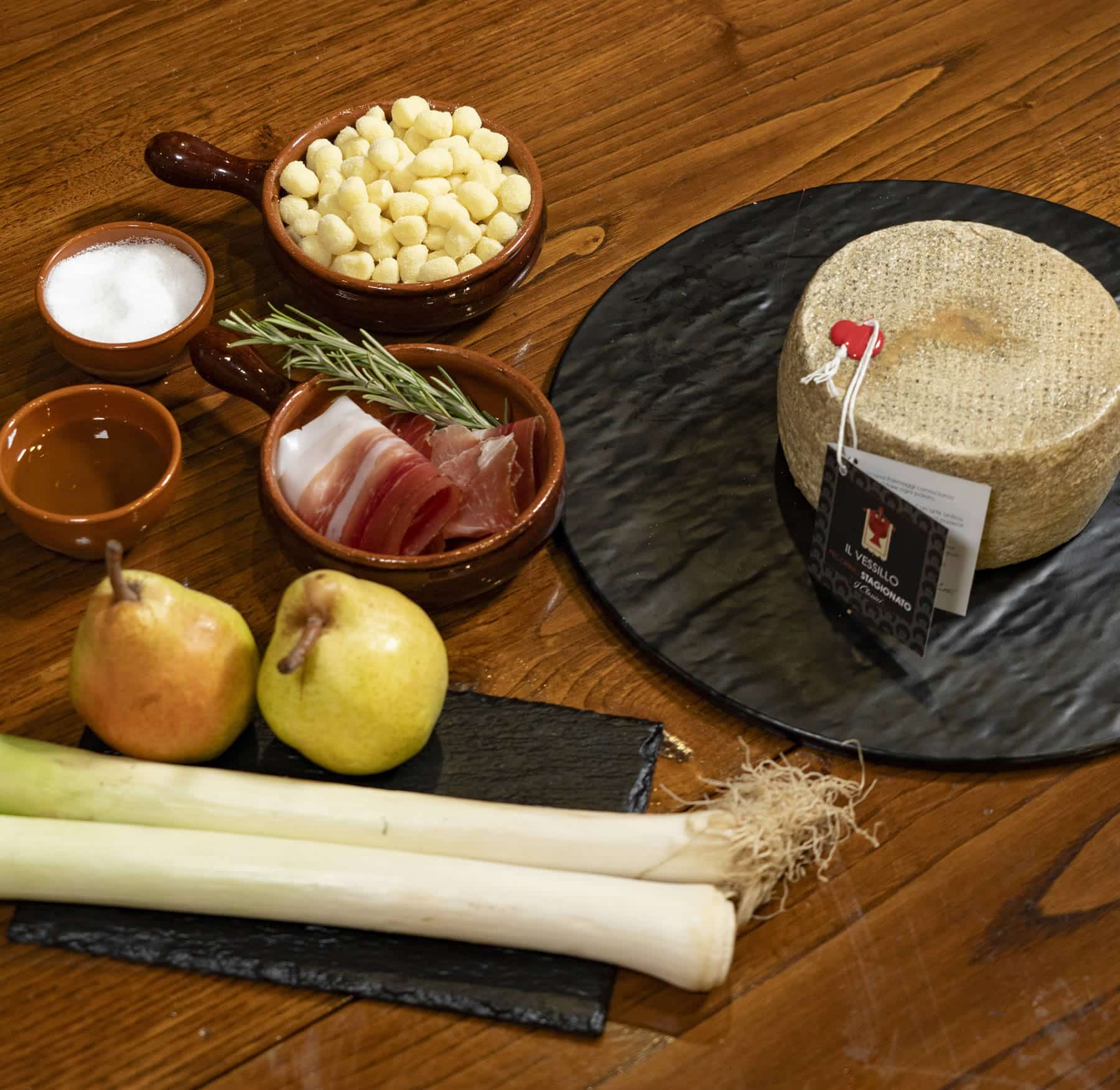 Disporre gli gnocchetti con i porri nei piatti, completare con cubetti di pera e speck croccante e una generosa dose di Vessillo a finire.
