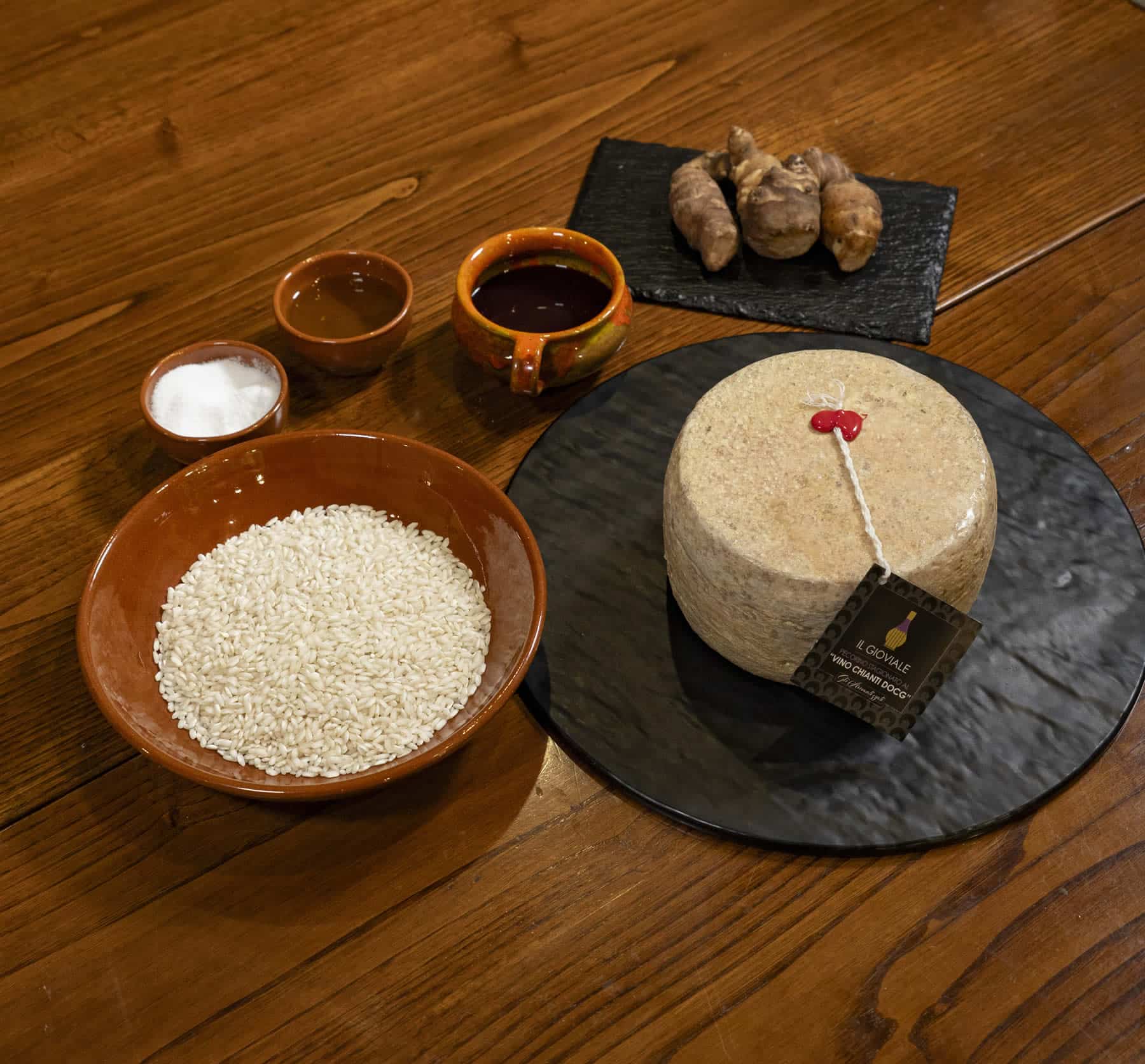 Disporre il risotto nel piatto, completare con cubetti di Gioviale fresco, la riduzione di vino rosso e le chips croccanti di topinambur.